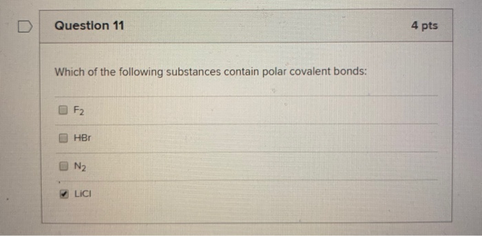 4 All of the following substances have polar covalent bonds. Which of the following compounds has polar covalent bonds. 3 on a question Which of the following compounds has polar covalent bonds.